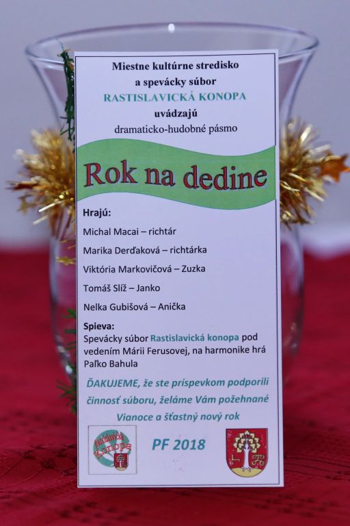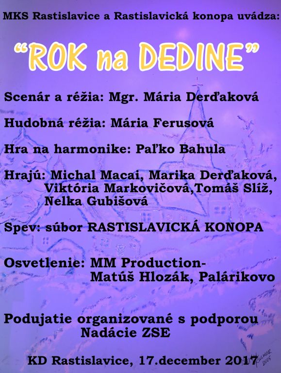 Výnimočnú bodku za kultúrno-spoločenskými akciami v Rastislaviciach dalo v nedeľu 17.12. divadelno-hudobné pásmo "ROK NA DEDINE", ktoré organizovalo Miestne kultúrne stredisko a spevácky súbor Rastislavická konopa. V rámci predstavenia boli uvedené všetky zvyky a tradície, ktoré v priebehu roka rodina a dedina prežíva.