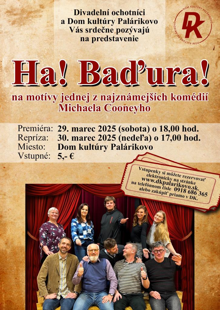 Prvý májový slnečný deň sa 33 Rastislavčanov, prevažne seniorov, vybralo na divadelné predstavenie Ha! Baďura! Toto predstavenie, inšpirované známou komédiou Michaela Cooneyho, „Nájomníci pána Swana“, sa konalo v Dome kultúry Palárikovo a uviedol ho miestny ochotnícky súbor v spolupráci s Domom kultúry.