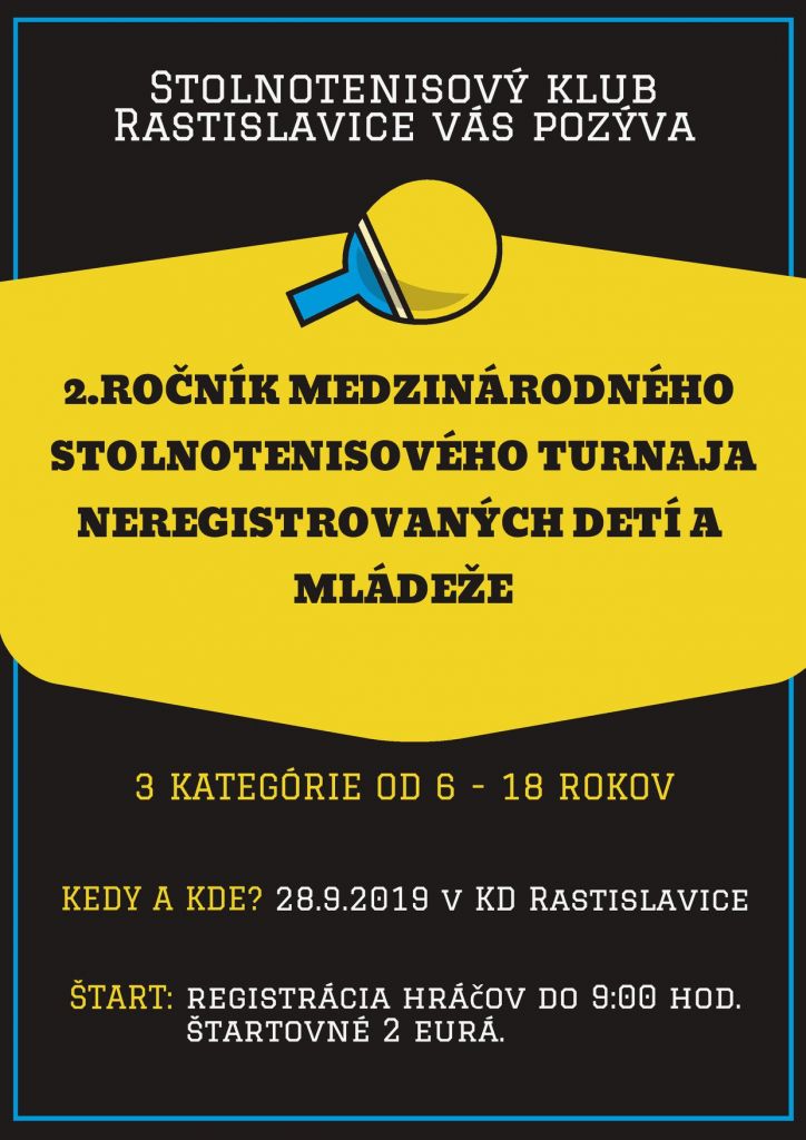 Milí priaznivci stolného tenisu, dovoľte nám Vás srdečne pozvať na 2.ročník medzinárodného stolnotenisového turnaja neregistrovaných detí a mládeže, ktorý sa uskutoční 28.9.2019 v KD Rastislavice. Predstavia sa tam tri kategórie súťažiacich detí. Všetci ste srdečne vítaní!